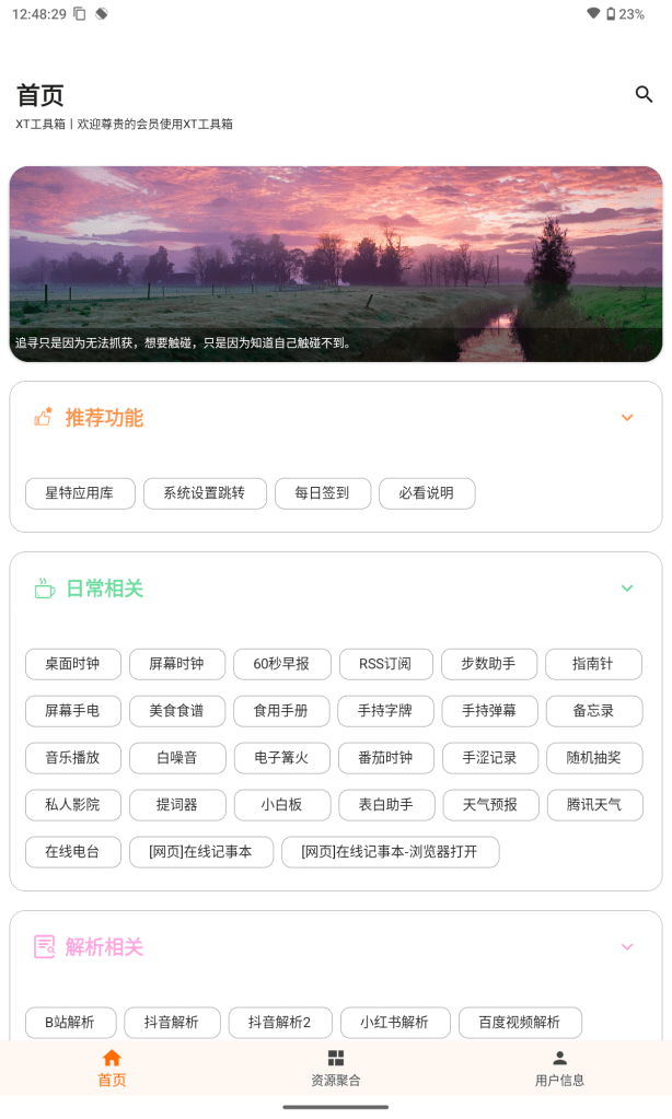 XT工具箱是一款轻量级多功能聚合应用,整合了全网热门资源与便捷工具,涵盖各种生活工具,把对个独立功能应用集合在一起,且免费、干净、简洁、无广、绿色安全,大部分功能本地实现,即使没有网络也能用,做你的生活好助手!